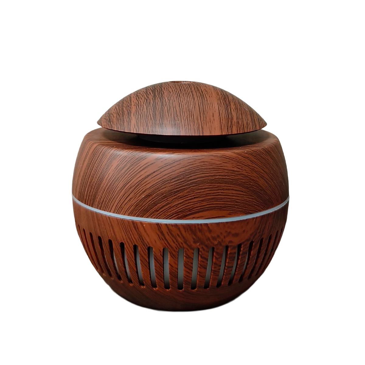 El humidificador Bola con rayas efecto Madera Oscura combina elegancia, funcionalidad y bienestar en un solo dispositivo. Su diseño con textura de madera oscura y líneas decorativas aporta un estilo sofisticado y natural, ideal para hogares con decoración rústica, minimalista o zen. Su forma redonda lo hace perfecto para colocar sobre mesas, estanterías o escritorios sin ocupar apenas espacio.